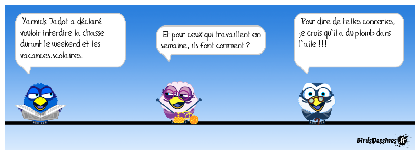 Case 1:Bird 1: Yannick Jadot a déclaré vouloir interdire la chasse durant le weekend et les vacances.scolaires. | Case 2: Bird 1: Et pour ceux qui travaillent en semaine, ils font comment ? | Case 3: Bird 1: Pour dire de telles conneries, je crois qu’il a du plomb dans l’aile !!!