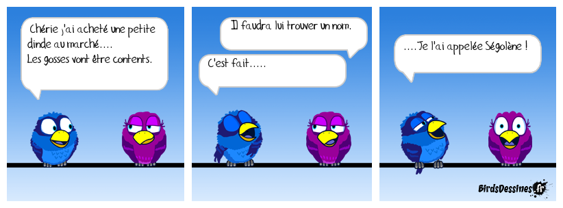 Case 1:Bird 1: Chérie j'ai acheté une petite dinde au marché.... Les gosses vont être contents. | Case 2: Bird 1: Il faudra lui trouver un nom. Bird 2: C'est fait..... | Case 3: Bird 1: ....Je l'ai appelée Ségolène !