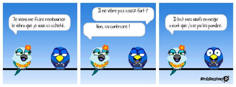 Case 1:Bird 1: Je viens me faire rembourser le vibro que je vous ai acheté. | Case 2: Bird 1: Il ne vibre pas assez fort ? Bird 2: Non, au contraire ! | Case 3: Bird 1: Il bat mes œufs en neige avant que j'aie pu les pondre.