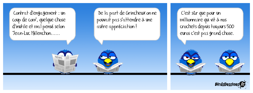 Case 1:Bird 1: Contrat d'engagement : un coup de com', quelque chose d'inutile et mal pensé selon Jean-Luc Mélenchon...... | Case 2: Bird 1: De la part de Grincheux on ne pouvait pas s'attendre à une autre appréciation ! | Case 3: Bird 1: C'est sûr que pour un millionnaire qui vit à nos crochets depuis toujours 500 euros c'est pas grand chose.