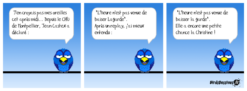 Case 1:Bird 1: J'en croyais pas mes oreilles cet après midi... Depuis le CHU de Montpellier, Jean Castex a déclaré : | Case 2: Bird 1: "L'heure n'est pas venue de baiser Lagarde". Après un replay, j'ai mieux entendu : | Case 3: Bird 1: "L'heure n'est pas venue de baisser la garde". Elle a encore une petite chance la Christine !
