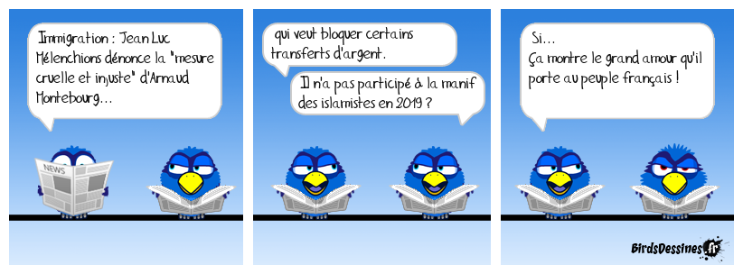 Case 1:Bird 1: Immigration : Jean Luc Mélenchions dénonce la "mesure cruelle et injuste" d'Arnaud Montebourg... | Case 2: Bird 1: qui veut bloquer certains transferts d'argent. Bird 2: Il n'a pas participé à la manif des islamistes en 2019 ? | Case 3: Bird 1: Si... Ça montre le grand amour qu'il porte au peuple français !