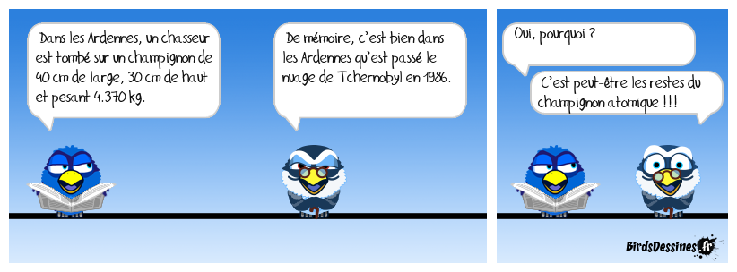 Case 1:Bird 1: Dans les Ardennes, un chasseur est tombé sur un champignon de 40 cm de large, 30 cm de haut et pesant 4.370 kg. | Case 2: Bird 1: De mémoire, c’est bien dans les Ardennes qu’est passé le nuage de Tchernobyl en 1986. | Case 3: Bird 1: Oui, pourquoi ? Bird 2: C’est peut-être les restes du champignon atomique !!!