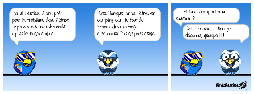Case 1:Bird 1: Salut Maurice. Alors, prêt pour la troisième dose ? Sinon, le pass sanitaire est annulé après le 15 décembre. | Case 2: Bird 1: Avec Monique, on va faire, en camping-car, le tour de France des meetings électoraux.Pas de pass exigé. | Case 3: Bird 1: Et tu vas rapporter un souvenir ? Bird 2: Oui, le Covid.....Non, je déconne, quoique !!!