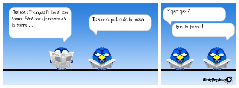 Case 1:Bird 1: Justice : François Fillon et son épouse Pénélope de nouveau à la barre.... | Case 2: Bird 1: Ils sont capable de la piquer. | Case 3: Bird 1: Piquer quoi ? Bird 2: Ben, la barre !