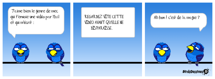 Case 1:Bird 1: J'aime bien le genre de mec qui t'envoie une vidéo par Mail et qui m'écrit : | Case 2: Bird 1: REGARDEZ VITE CETTE VIDÉO AVANT QU'ELLE NE DISPARAISSE. | Case 3: Bird 1: Ah bon ! c'est de la magie ?