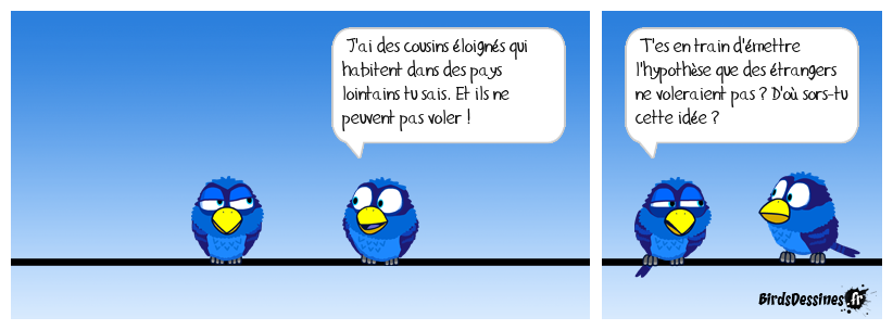 Case 1: | Case 2: Bird 1: J'ai des cousins éloignés qui habitent dans des pays lointains tu sais. Et ils ne peuvent pas voler ! | Case 3: Bird 1: T'es en train d'émettre l'hypothèse que des étrangers ne voleraient pas ? D'où sors-tu cette idée ?