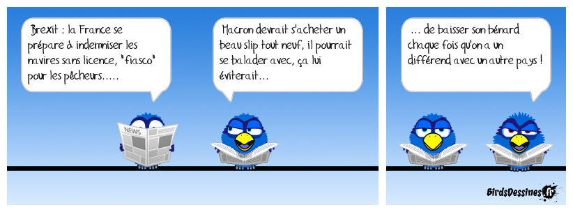 Case 1:Bird 1: Brexit : la France se prépare à indemniser les navires sans licence, "fiasco" pour les pêcheurs..... | Case 2: Bird 1: Macron devrait s'acheter un beau slip tout neuf, il pourrait se balader avec, ça lui éviterait... | Case 3: Bird 1: ... de baisser son bénard chaque fois qu'on a un différend avec un autre pays !