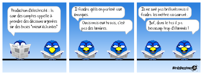 Case 1:Bird 1: Production d'électricité : la cour des comptes appelle à prendre des décisions urgentes sur des bases "mieux éclairées" | Case 2: Bird 1: Il faudra qu'ils en parlent aux énarques. Bird 2: Ouais mais eux tu sais, c'est pas des lumières. | Case 3: Bird 1: Ils ne sont pas brillants mais il faudra les mettre au courant. Bird 2: Bof, dans le tas il y a beaucoup trop d'illuminés !