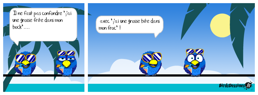 Case 1:Bird 1: Il ne faut pas confondre "j'ai une grosse frite dans mon bock".... | Case 2: Bird 1: avec "j'ai une grosse bite dans mon froc" ! | Case 3: