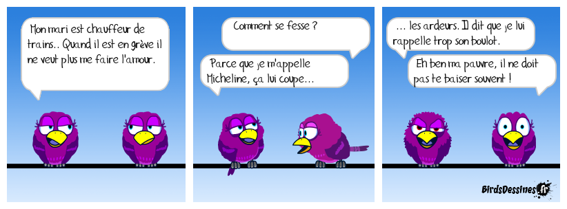 Case 1:Bird 1: Mon mari est chauffeur de trains.. Quand il est en grève il ne veut plus me faire l'amour. | Case 2: Bird 1: Comment se fesse ? Bird 2: Parce que je m'appelle Micheline, ça lui coupe... | Case 3: Bird 1: ... les ardeurs. Il dit que je lui rappelle trop son boulot. Bird 2: Eh ben ma pauvre, il ne doit pas te baiser souvent !