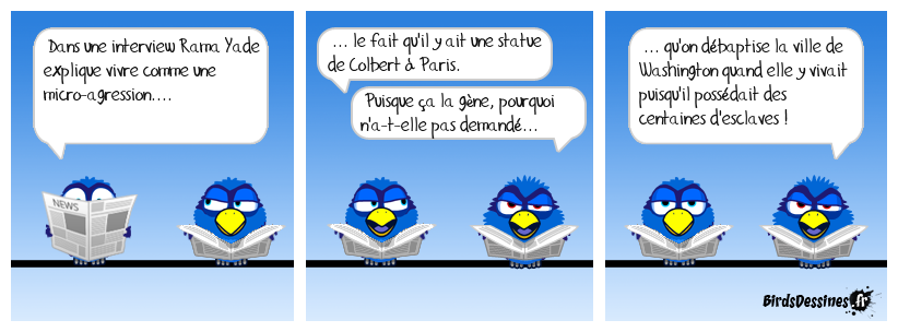 Case 1:Bird 1: Dans une interview Rama Yade explique vivre comme une micro-agression.... | Case 2: Bird 1: ... le fait qu'il y ait une statue de Colbert à Paris. Bird 2: Puisque ça la gène, pourquoi n'a-t-elle pas demandé... | Case 3: Bird 1: ... qu'on débaptise la ville de Washington quand elle y vivait puisqu'il possédait des centaines d'esclaves !