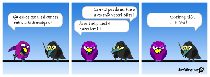 Case 1:Bird 1: Qu' est-ce que c' est que ces notes catastrophiques ! | Case 2: Bird 1: Ce n' est pas de ma faute si vos enfants sont bêtes ! Bird 2: Je vais me plaindre au rectorat ! | Case 3: Bird 1: Appelez plutôt... ... la SPA !
