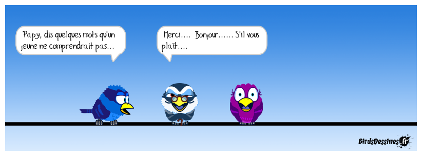 Case 1:Bird 1: Papy, dis quelques mots qu'un jeune ne comprendrait pas... | Case 2: Bird 1: Merci.... Bonjour...... S'il vous plaît.... | Case 3: