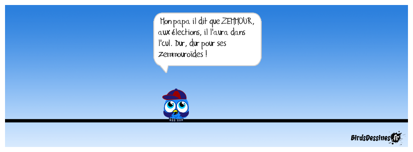 Case 1: | Case 2: Bird 1: Mon papa il dit que ZEMMOUR, aux élections, il l'aura dans l'cul. Dur, dur pour ses zemmouroîdes ! | Case 3: