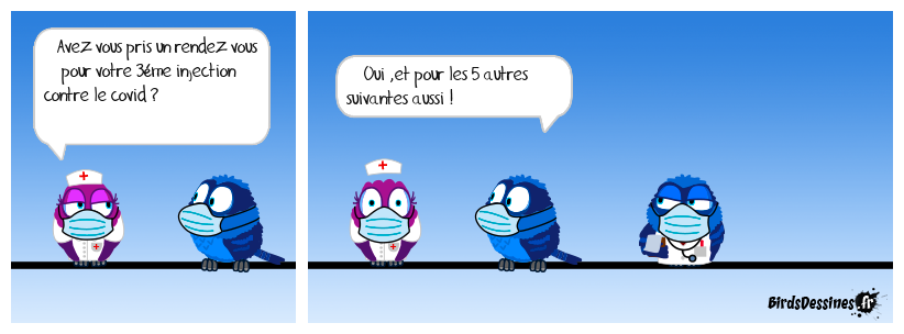 Case 1:Bird 1: Avez vous pris un rendez vous pour votre 3éme injection contre le covid ? | Case 2: Bird 1: Oui ,et pour les 5 autres suivantes aussi ! Bird 2: Oui ,et pour les 5 autres d'après! | Case 3: