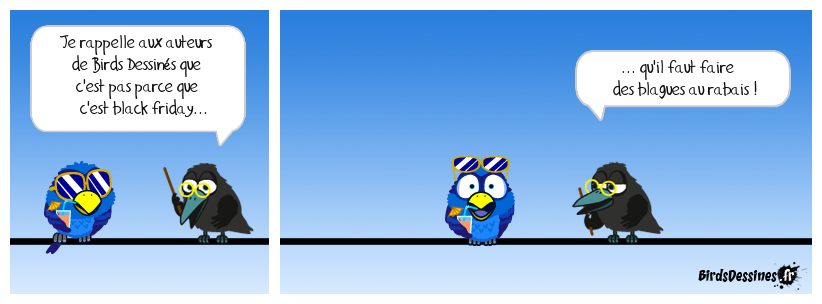 Case 1:Bird 1: Je rappelle aux auteurs de Birds Dessinés que c'est pas parce que c'est black friday... | Case 2: | Case 3: Bird 1: ... qu'il faut faire des blagues au rabais !