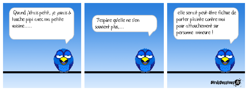 Case 1:Bird 1: Quand j'étais petit, je jouais à touche pipi avec ma petite voisine..... | Case 2: Bird 1: J'espère qu'elle ne s'en souvient plus,... | Case 3: Bird 1: elle serait peut-être fichue de porter plainte contre moi pour attouchement sur personne mineure !