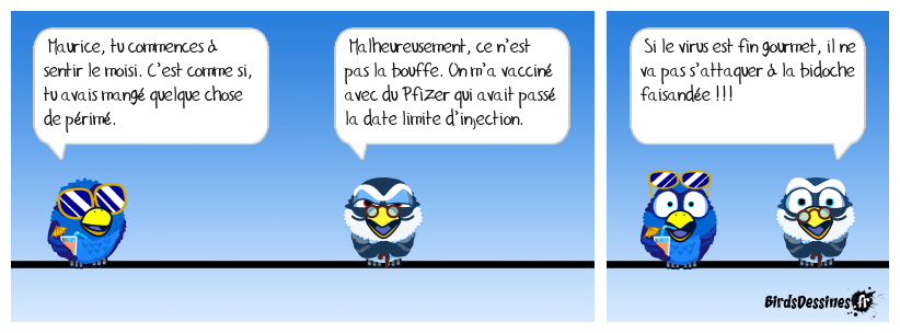 Case 1:Bird 1: Maurice, tu commences à sentir le moisi. C’est comme si, tu avais mangé quelque chose de périmé. | Case 2: Bird 1: Malheureusement, ce n’est pas la bouffe. On m’a vacciné avec du Pfizer qui avait passé la date limite d’injection. | Case 3: Bird 1: Si le virus est fin gourmet, il ne va pas s’attaquer à la bidoche faisandée !!!