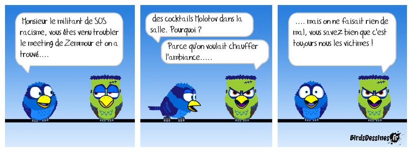 Case 1:Bird 1: Monsieur le militant de SOS racisme, vous êtes venu troubler le meeting de Zemmour et on a trouvé.... | Case 2: Bird 1: des cocktails Molotov dans la salle. Pourquoi ? Bird 2: Parce qu'on voulait chauffer l'ambiance..... | Case 3: Bird 1: .... mais on ne faisait rien de mal, vous savez bien que c'est toujours nous les victimes !