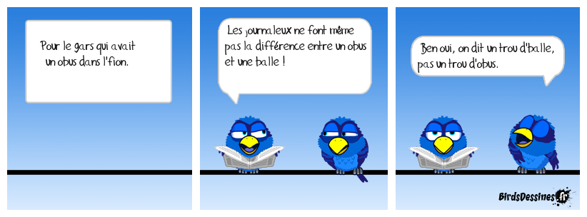 Case 1:Bird 1: Pour le gars qui avait un obus dans l'fion. | Case 2: Bird 1: Les journaleux ne font même pas la différence entre un obus et une balle ! | Case 3: Bird 1: Ben oui, on dit un trou d'balle, pas un trou d'obus.