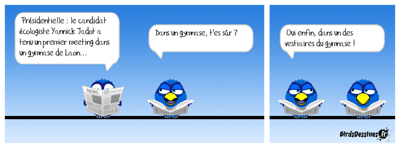 Case 1:Bird 1: Présidentielle : le candidat écologiste Yannick Jadot a tenu un premier meeting dans un gymnase de Laon... | Case 2: Bird 1: Dans un gymnase, t'es sûr ? | Case 3: Bird 1: Oui enfin, dans un des vestiaires du gymnase !
