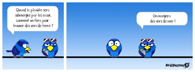 Case 1:Bird 1: Quand la planète sera submergée par les eaux, comment on fera pour trouver des vers de terre ? | Case 2: | Case 3: Bird 1: On mangera des vers de mer !
