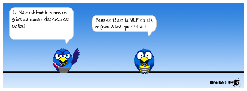Case 1:Bird 1: La SNCF est tout le temps en grève au moment des vacances de Noël. | Case 2: Bird 1: Faux en 18 ans la SNCF n'a été en grève à Noël que 13 fois ! | Case 3: