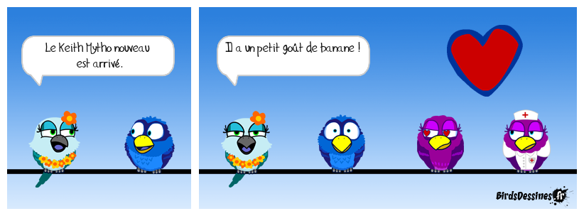 Case 1:Bird 1: Le Keith Mytho nouveau est arrivé. | Case 2: Bird 1: Il a un petit goût de banane ! | Case 3: