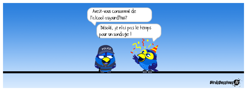 Case 1: | Case 2: Bird 1: Avez-vous consommé de l'alcool aujourd'hui? Bird 2: Désolé, je n'ai pas le temps pour un sondage ! | Case 3: