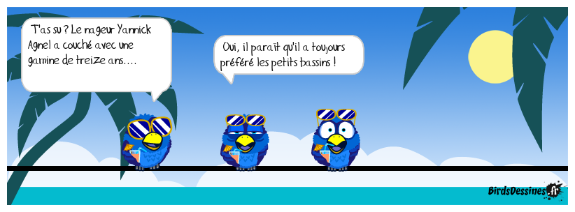 Case 1:Bird 1: T'as su ? Le nageur Yannick Agnel a couché avec une gamine de treize ans.... | Case 2: Bird 1: Oui, il paraît qu'il a toujours préféré les petits bassins ! | Case 3: