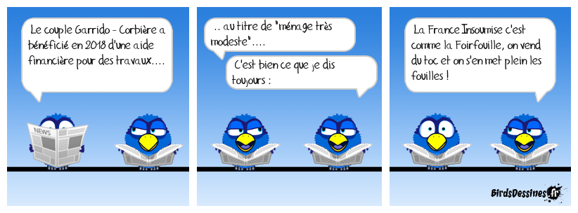 Case 1:Bird 1: Le couple Garrido - Corbière a bénéficié en 2018 d'une aide financière pour des travaux.... | Case 2: Bird 1: .. au titre de "ménage très modeste".... Bird 2: C'est bien ce que je dis toujours : | Case 3: Bird 1: La France Insoumise c'est comme la Foirfouille, on vend du toc et on s'en met plein les fouilles !
