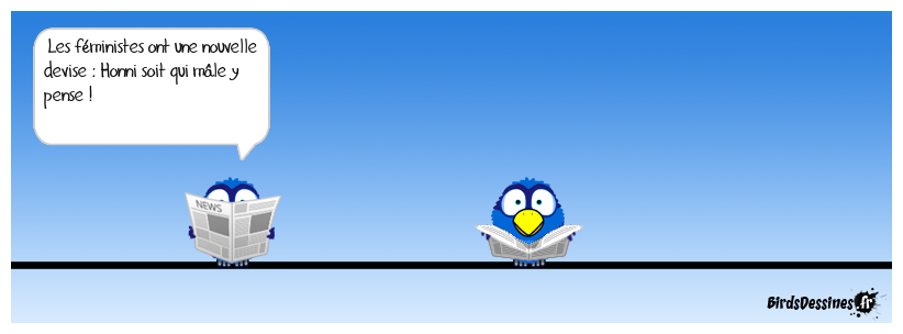 Case 1:Bird 1: Les féministes ont une nouvelle devise : Honni soit qui mâle y pense ! | Case 2: | Case 3: