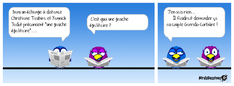 Case 1:Bird 1: Dans un échange à distance Christiane Taubira et Yannick Jadot préconisent "une gauche égalitaire".... | Case 2: Bird 1: C'est quoi une gauche égalitaire ? | Case 3: Bird 1: J'en sais rien... Il faudrait demander ça au couple Garrido-Corbière !
