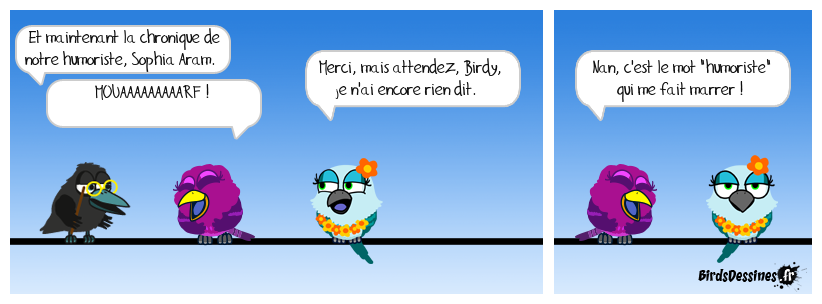 Case 1:Bird 1: Et maintenant la chronique de notre humoriste, Sophia Aram.Bird 2: MOUAAAAAAAAARF ! | Case 2: Bird 1: Merci, mais attendez, Birdy, je n'ai encore rien dit. | Case 3: Bird 1: Nan, c'est le mot "humoriste" qui me fait marrer !
