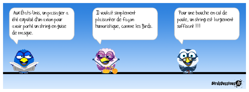Case 1:Bird 1: Aux Ètats-Unis, un passager a été expulsé d'un avion pour avoir porté un string en guise de masque. | Case 2: Bird 1: Il voulait simplement plaisanter de façon humoristique, comme les Birds. | Case 3: Bird 1: Pour une bouche en cul de poule, un string est largement suffisant !!!