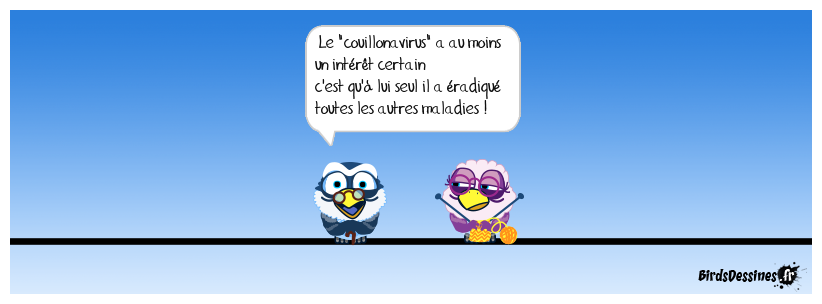 Case 1: | Case 2: Bird 1: Le "couillonavirus" a au moins un intérêt certain c'est qu'à lui seul il a éradiqué toutes les autres maladies ! | Case 3: