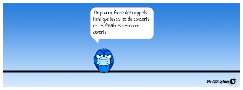 Case 1: | Case 2: Bird 1: On pourra faire des rappels... tant que les salles de concerts et les théâtres resteront ouverts ! | Case 3: