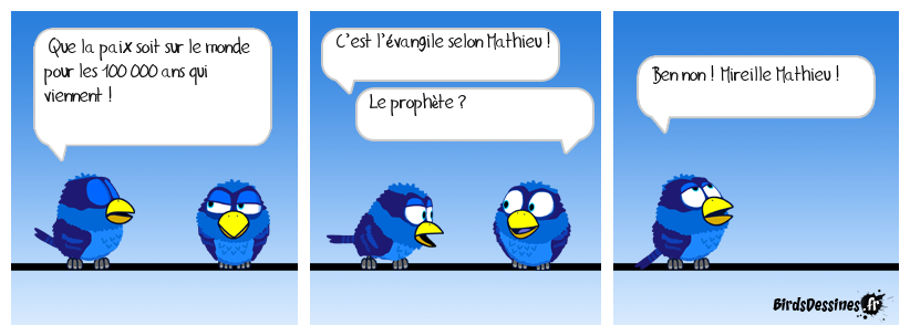 Case 1:Bird 1: Que la paix soit sur le monde pour les 100 000 ans qui viennent ! | Case 2: Bird 1: C’est l’évangile selon Mathieu ! Bird 2: Le prophète ? | Case 3: Bird 1: Ben non ! Mireille Mathieu !