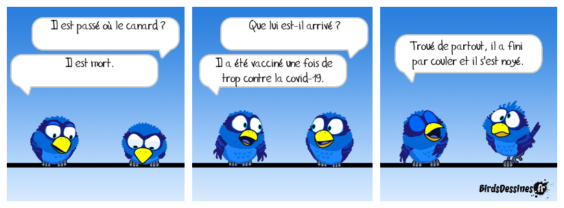 Case 1:Bird 1: Il est passé où le canard ?Bird 2: Il est mort. | Case 2: Bird 1: Que lui est-il arrivé ? Bird 2: Il a été vacciné une fois de trop contre la covid-19. | Case 3: Bird 1: Troué de partout, il a fini par couler et il s'est noyé.