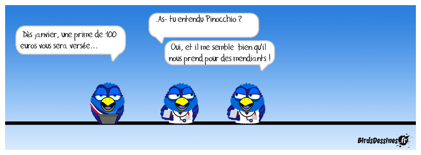Case 1:Bird 1: Dès janvier, une prime de 100 euros vous sera versée... | Case 2: Bird 1: .As- tu entendu Pinocchio ? Bird 2: Oui, et il me semble bien qu'il nous prend pour des mendiants ! | Case 3: