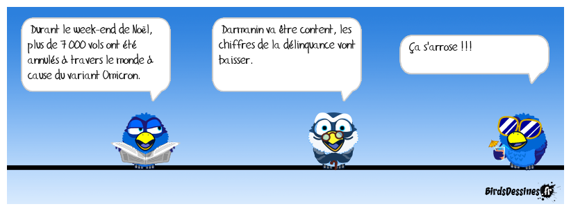 Case 1:Bird 1: Durant le week-end de Noël, plus de 7 000 vols ont été annulés à travers le monde à cause du variant Omicron. | Case 2: Bird 1: Darmanin va être content, les chiffres de la délinquance vont baisser. | Case 3: Bird 1: Ça s'arrose !!!