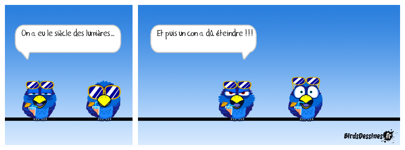 Case 1:Bird 1: On a eu le siècle des lumières… | Case 2: Bird 1: Et puis un con a dû éteindre !!! | Case 3: