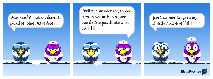 Case 1:Bird 1: Assis, couché, debout, donne la papatte, 3ème, 4ème dose ... | Case 2: Bird 1: Arrête ça maintenant, ils sont bien dressés mais ils ne sont quand même pas débiles à ce point !!! | Case 3: Bird 1: Ben à ce point là, je ne m'y attendais pas en effet !