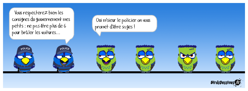 Case 1:Bird 1: Vous respecterez bien les consignes du gouvernement mes petits : ne pas être plus de 6 pour brûler les voitures... | Case 2: Bird 1: Oui m'sieur le policier on vous promet d'être sages ! | Case 3: