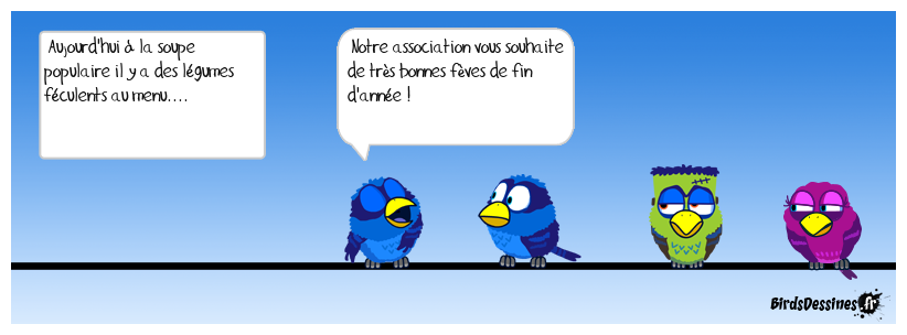Case 1:Bird 1: Aujourd'hui à la soupe populaire il y a des légumes féculents au menu.... | Case 2: Bird 1: Notre association vous souhaite de très bonnes fèves de fin d'année ! | Case 3:
