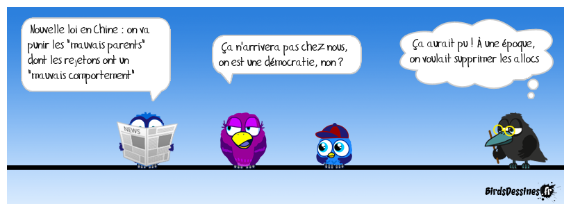 Case 1:Bird 1: Nouvelle loi en Chine : on va punir les "mauvais parents" dont les rejetons ont un "mauvais comportement" | Case 2: Bird 1: Ça n'arrivera pas chez nous, on est une démocratie, non ? | Case 3: Bird 1: Ça aurait pu ! À une époque, on voulait supprimer les allocs
