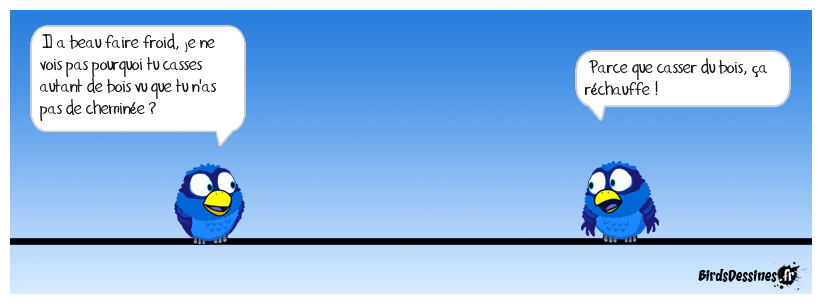 Case 1:Bird 1: Il a beau faire froid, je ne vois pas pourquoi tu casses autant de bois vu que tu n'as pas de cheminée ? | Case 2: | Case 3: Bird 1: Parce que casser du bois, ça réchauffe !
