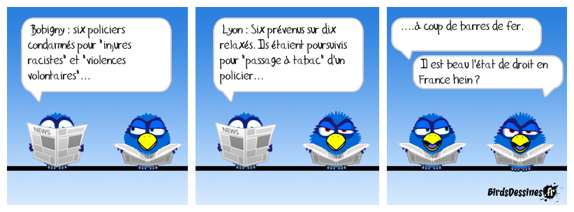 Case 1:Bird 1: Bobigny : six policiers condamnés pour "injures racistes" et "violences volontaires"... | Case 2: Bird 1: Lyon : Six prévenus sur dix relaxés. Ils étaient poursuivis pour "passage à tabac" d'un policier... | Case 3: Bird 1: ....à coup de barres de fer. Bird 2: Il est beau l'état de droit en France hein ?
