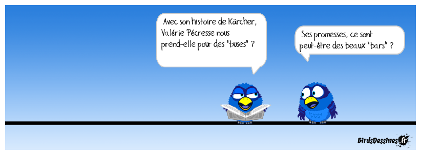 Case 1: | Case 2: Bird 1: Avec son histoire de Kärcher, Valérie Pécresse nous prend-elle pour des "buses" ? | Case 3: Bird 1: Ses promesses, ce sont peut-être des beaux "bars" ?